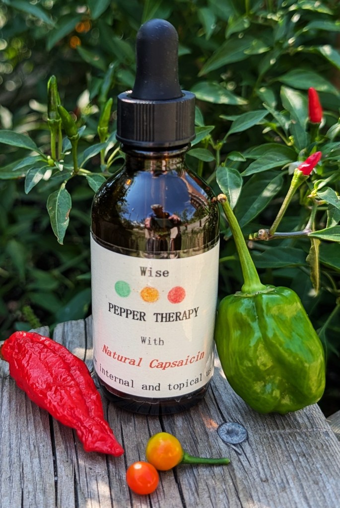 Wise Pepper Therapy, delivers capsaicin from a global array of peppers, including: Chiltepin, Naga Morich, Cayenne, Habanero, Bhut Jolokia, Scotch Bonnet, Dalle Khursani, Carolina Reaper, grown and prepared by Stephen Wise.